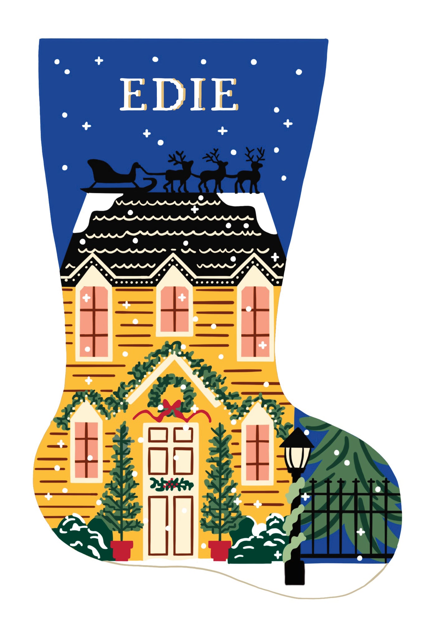 A handmade needlepoint Christmas stocking is the perfect holiday heirloom — something to be enjoyed year after year. This DIY stocking canvas shows a warm and welcoming holiday home with Santa's sleigh on the roof.