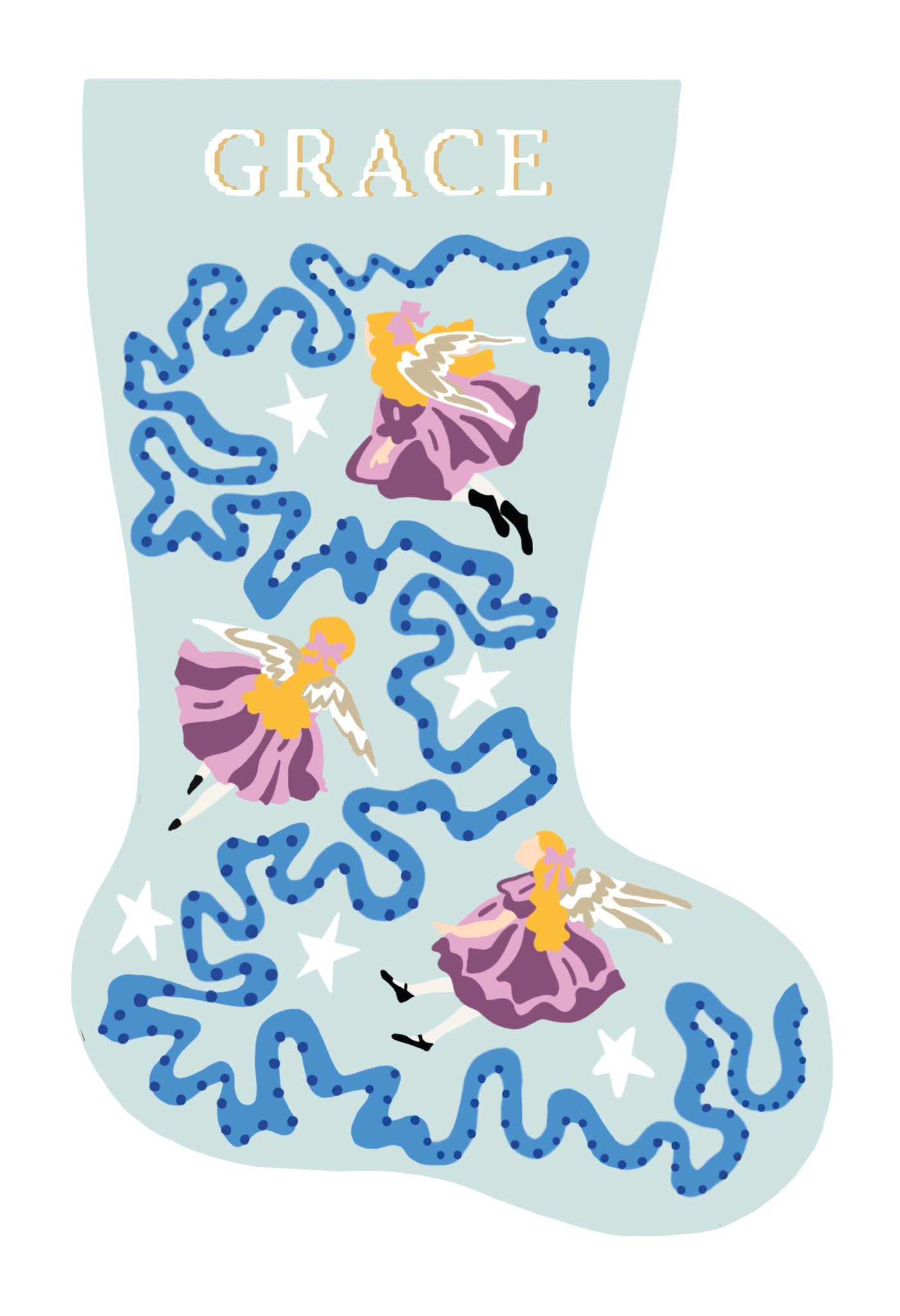 A handmade needlepoint Christmas stocking is the perfect holiday heirloom — something to be enjoyed year after year. Three angels soar across this pastel stocking, delivering tidings of comfort and joy amongst the stars.
