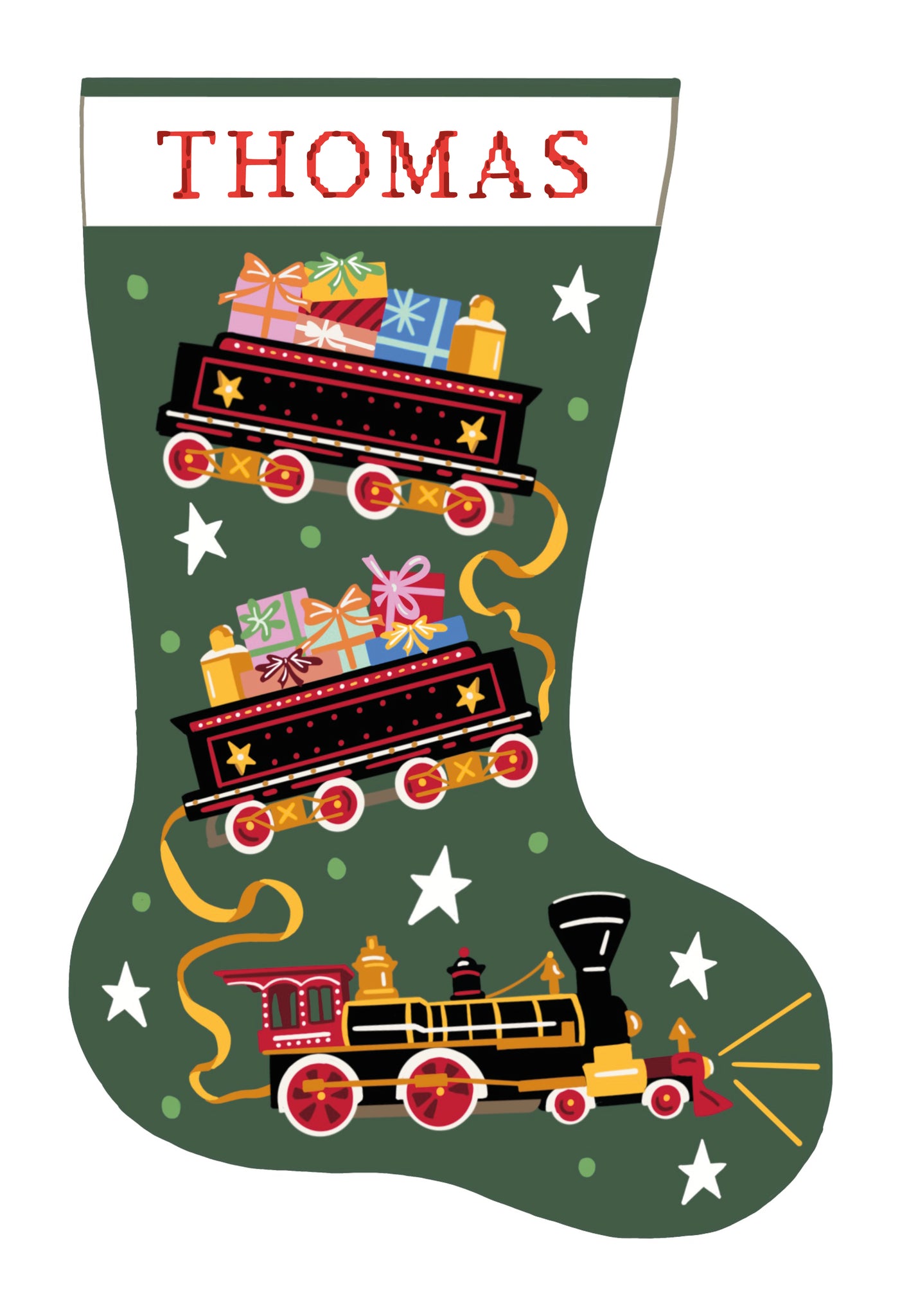 A handmade needlepoint Christmas stocking is the perfect holiday heirloom — something to be enjoyed year after year. A magical train, bustling with presents and twinkling stars, chugs across a dreamy midnight sky. This scene is designed to stir up childhood wonder and holiday anticipation.